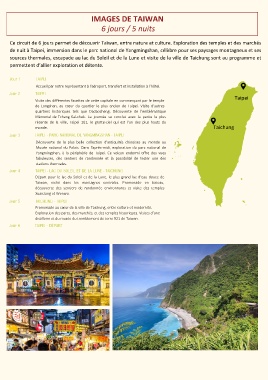 Ce circuit de 6 jours permet de découvrir Taïwan, entre nature et culture. Exploration des temples et des marchés