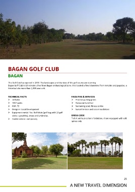 Bagan Golf Club is 10 minutes drive from Bagan archaeological zone. It is located a few kilometres from temples and pagodas, a