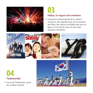 • ƌŽŝƐƐĂŶĐĞ ƉŚĠŶŽŵĠŶĂůĞ ĚĞ ůĂ ĐƵůƚƵƌĞ ĐŽƌĠĞŶŶĞ͕ ƋƵŝ ĞŶŐůŽďĞ ƚŽƵƚ͕ ĚĞ ůĂ ŵƵƐŝƋƵĞ͕ ĚĞƐ ĮůŵƐ͕ ĚĞƐ ƉŝğĐĞƐ ĚĞ ƚŚĠąƚƌĞ ĂƵdž ũĞƵdž ĞŶ ůŝŐŶĞ Ğƚ ă ůĂ ĐƵŝƐŝŶĞ͕ ƉŽƵƌ ŶĞ ĐŝƚĞƌ ƋƵĞ ƋƵĞůƋƵĞƐ ĚŽŵĂŝŶĞƐ͘ • ŽƵƌƐ ĚĞ dĂĞŬǁŽŶĚŽ͕ ƐƉŽƌƚ ĚĞ ĐŽŵďĂƚ ŶĂƟŽŶĂů͘
