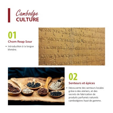 Cambodge • /ŶƚƌŽĚƵĐƟŽŶ ă ůĂ ůĂŶŐƵĞ ŬŚŵğƌĞ͘ • ĠĐŽƵǀĞƌƚĞ ĚĞƐ ƐĞŶƚĞƵƌƐ ůŽĐĂůĞƐ ŐƌąĐĞ ă ĚĞƐ ĂƚĞůŝĞƌƐ͕ Ğƚ ĚĞƐ ƐĞĐƌĞƚƐ ĚĞ ĨĂďƌŝĐĂƟŽŶ ĚĞ ƉƌŽĚƵŝƚƐ ƉĂƌĨƵŵĠƐ ŶĂƚƵƌĞůƐ ĐĂŵďŽĚŐŝĞŶƐ ŚĂƵƚ ĚĞ ŐĂŵŵĞ͘